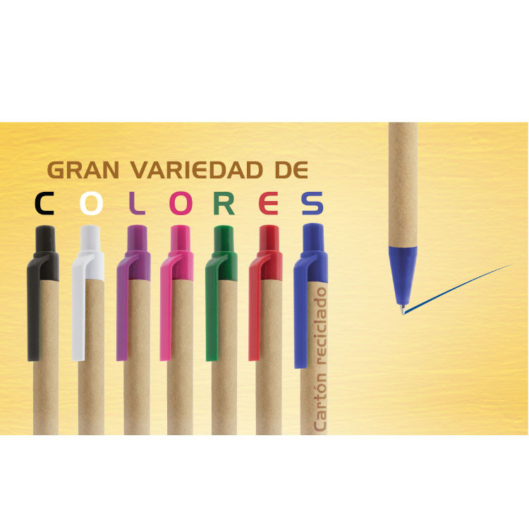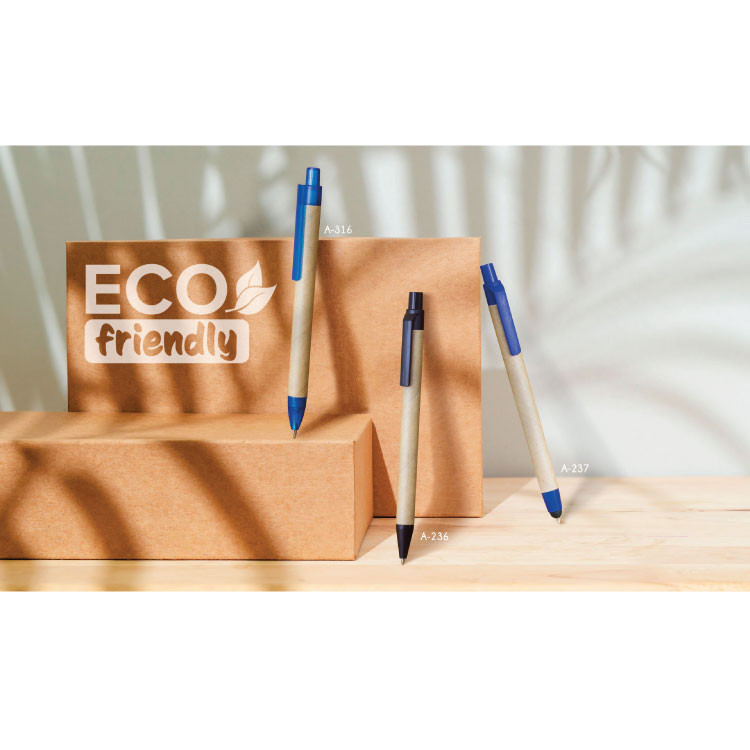Ова еко-френдли пенкало, направено од рециклирана хартија и пластика, е идеален избор за оние кои бараат стил и одржливост. Со црно мастило и клик механизам, пенкалото е достапно во девет различни бои – сина, црна, зелена, црвена, бела, виолетова, розова, темно зелена и портокалова. Со димензии од 140 мм висина и 10 мм радиус, ова пенкало е лесно за ракување и може да се персонализира според вашите потреби.
