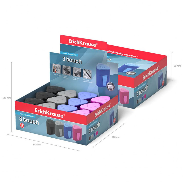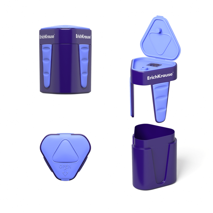 Пластичната оштрилка е со мат финиш, контејнер за собирање на остатиците при оштрење и нелизгачка гумена подлога.