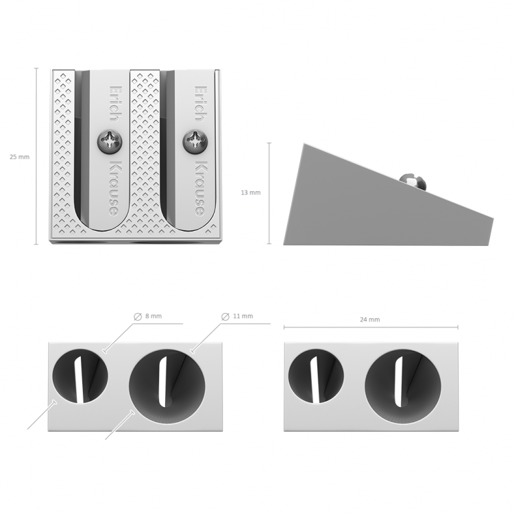 Оштрилката има две отвори од 8мм и 1мм во дијаметар за оштрење на стандардни моливи и дрвени боици.