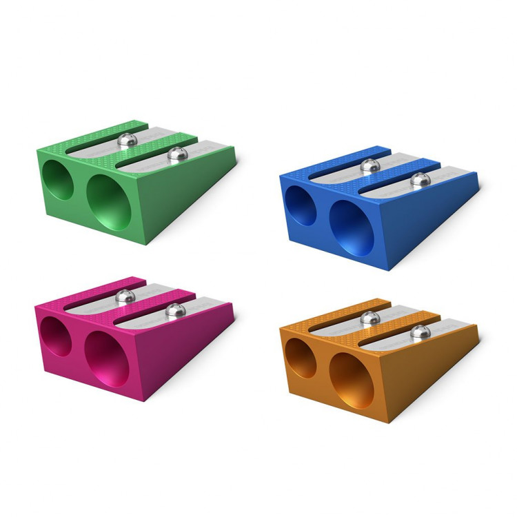 Двојна оштрилка во метално куќиште со ергономна зона за држење.