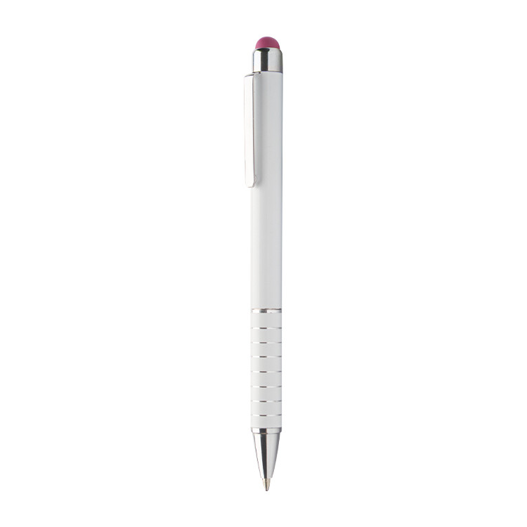 Модерно алуминиумско пенкало со бело тело и тач функција во боја, совршено за употреба со екрани на допир и секојдневно пишување. Со сино мастило и компактна форма, ова пенкало е идеално за промотивни кампањи и печатење на лого.