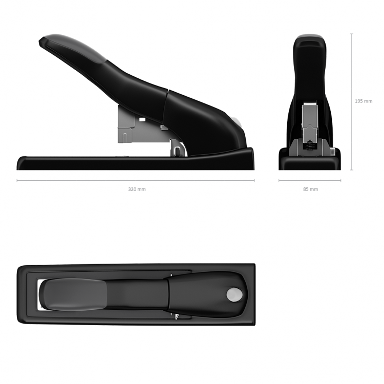 Хефталица за голем волумен на документи, произведена од пластика отпорна на удари, опремена со висококвалитетен челичен механизам и гумен вметнувач против лизгање.