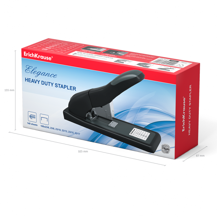 Хефталица за голем волумен на документи, произведена од пластика отпорна на удари, опремена со висококвалитетен челичен механизам и гумен вметнувач против лизгање. Максимален волумен на хефтање -140 листови- со употреба на 23/17 хефт иглици. Капацитет од 100 хефт иглици №24 / 6, 23/6, 23/8, 23/10, 23/13, 23/15, 23/17. Механизам за автоматско вклопување на хефт иглиците. Пластичната подлога на основата спречува гребење на површината на масата и помага да се избегне лизгање на хефталицата. Прилагодливо растојание до точката на прицврстување. Длабочина на хефтање 65мм.
