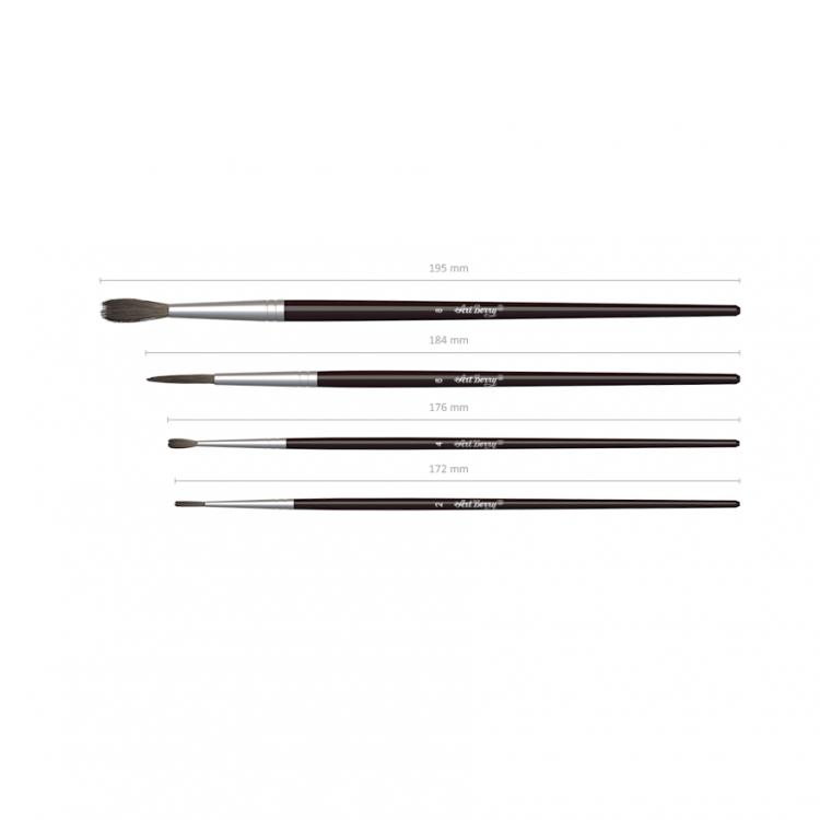 Четки ArtBerry® за цртање со акварели и гваш. Работниот дел на четката е покриен со гумена смеса, кое ја штити при складирање и транспорт. Рачката е изработена од природно дрво и покриена со заштитен лак. Целосно метална лесна ферула направена од алуминиум е отпорен на корозија.