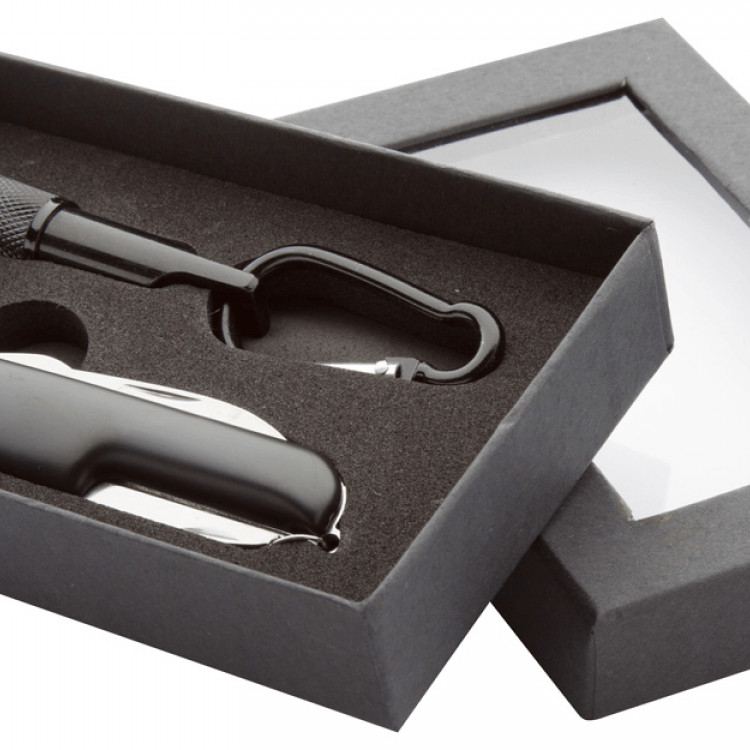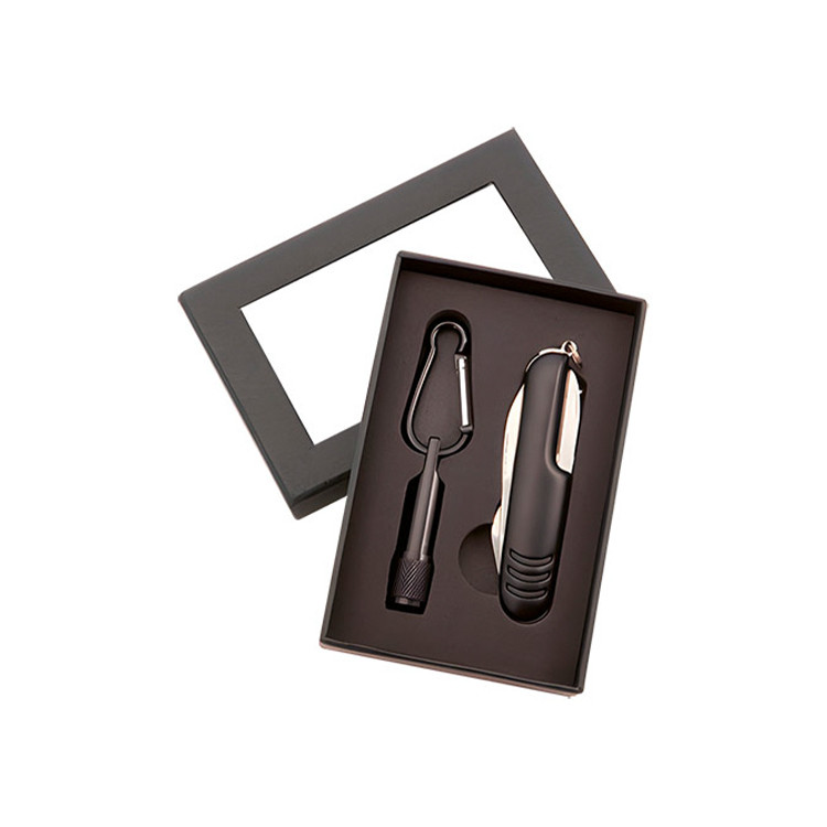 Џебен нож со 7 функции и мини светилка со 1 ЛЕД сијалица и привезок. Сетот е спакуван во црна кутија за подароци со батерии.