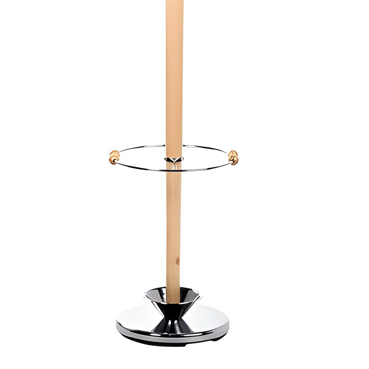 Оваа метална и дрвена стоечка закачалка за облека совршено ја балансира практичноста и визуелната привлечност. Таа е создадена да ги задоволи потребите за организирање на облека, чанти и чадори, истовремено правејќи го просторот поуреден и визуелно привлечен.