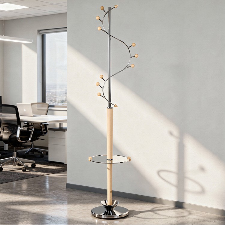 Оваа канцелариска закачалка има хромирани елементи, кои додаваат сјај и визуелен акцент, правејќи ја погодна како елегантна закачалка за канцеларија, влезни простори и јавни средини.