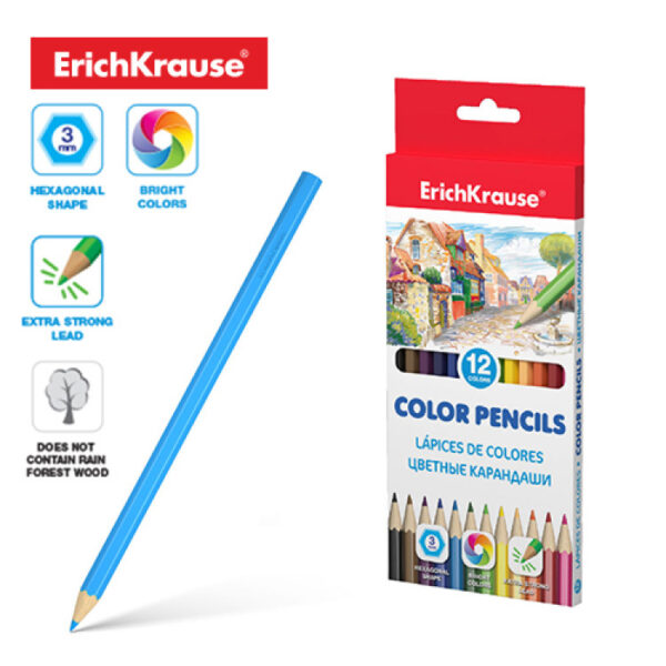 Класични шестоаголни дрвени боици ErichKrause® направени од селектирано дрво со супер-светли бои. Специјалната импрегнација на дрво и цврстото лепење на мината обезбедуваат висока отпорност при удар. Мекото дрво и совршено порамнетата мина гарантираат лесно острење со економична потрошувачка на боичката. Боичката со дијаметар од 3 мм нежно црта, не ја гребе хартијата и не се распаѓа. Европскиот сертификат за квалитет (CE) гарантира отсуство на токсични материи.