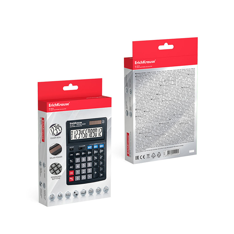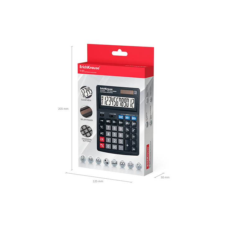 Електронски калкулатор од пластика со 12-цифрен LCD екран со акрилна обвивка. Има два мемориски клучеви. Оптималниот сет на функции за пресметување овозможува да се извршат основни математички операции, да се пресметаат проценти, маргина на продажба, да се извлече квадратниот корен, да се сумираат извршените операции и да се запамети средниот резултат. Погодната тастатура е опремена со копчиња со нула и копче „00“. Има и селектор за заокружување и селектор на децимална точка. Елементот за соларна енергија може да се наполни и од директна сончева светлина и од канцелариските светла, помагајќи да се заштеди алкалната батерија. Напојувањето на калкулаторот автоматски се исклучува ако уредот не се користи 7 минути.