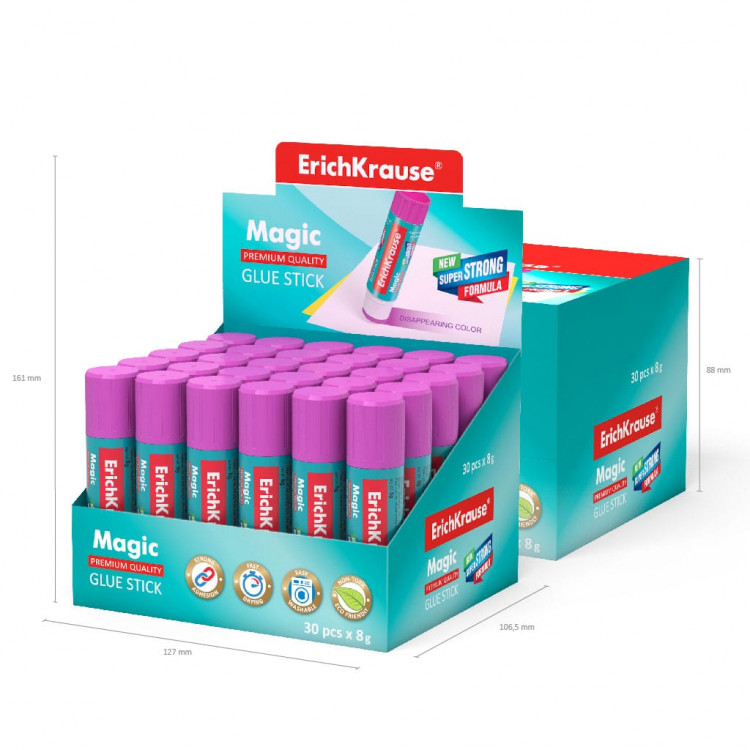 Лепило во стик со нова дополнително силна формула основана на PHP, брз и сигурен ефект. Кога се нанесува остава трага во боја што постепено исчезнува. Овој привремено видлив слој овозможува да следите каде бил нанесен производот. Економичен при употреба. Лесно се вади со вода. Нетоксичен и не содржи растворувачи. Отпорен на замрзнување. Погоден за хартија, картон и ткаенина.