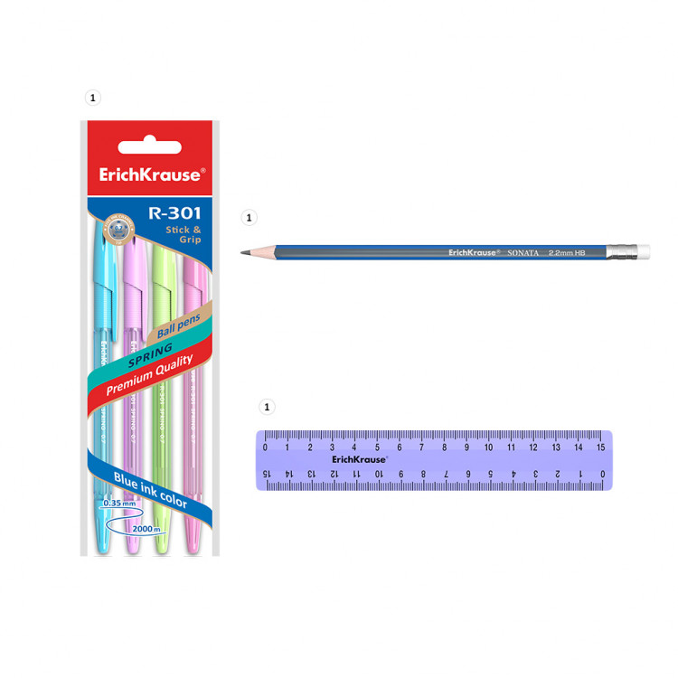Комплетот вклучува 6 артикли: 4 пенкала, молив, линијар.