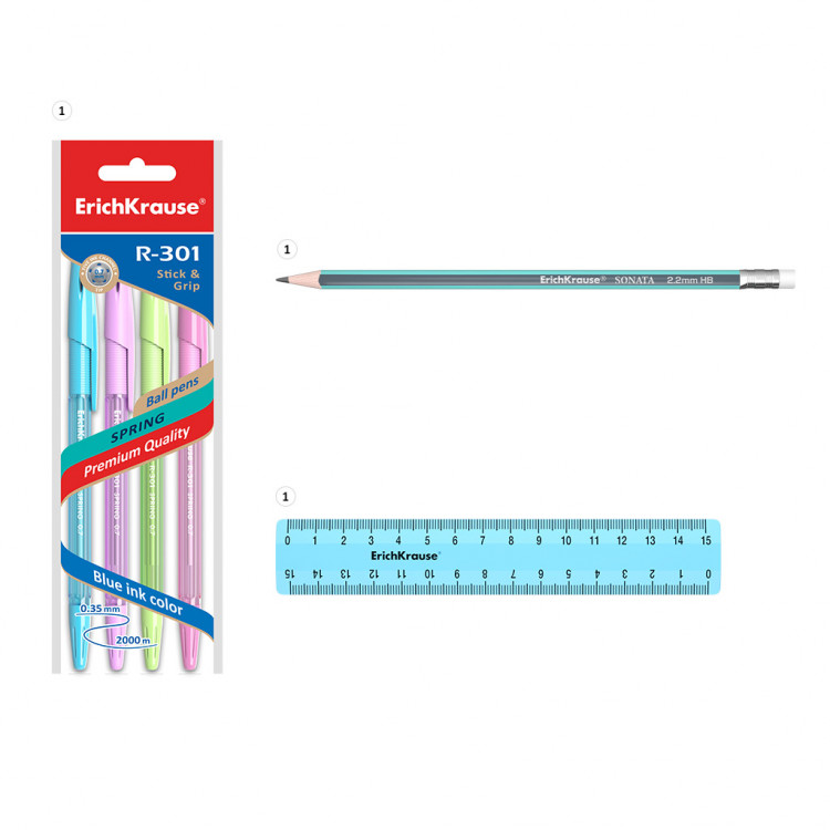 Комплетот вклучува 6 артикли: 4 пенкала, молив, линијар.