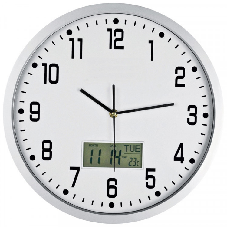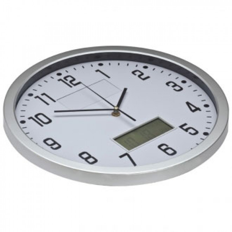 Аналоген ѕиден часовник CrisMa со голем дигитален дисплеј кој покажува датум, ден и температура.