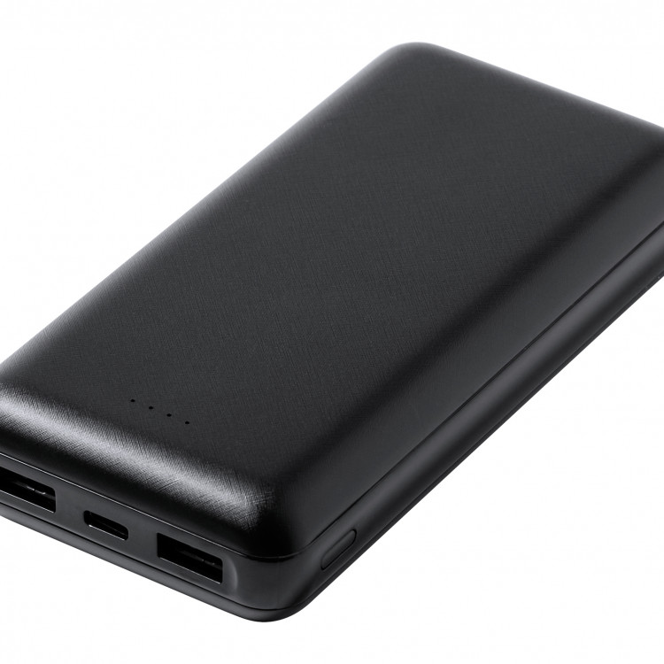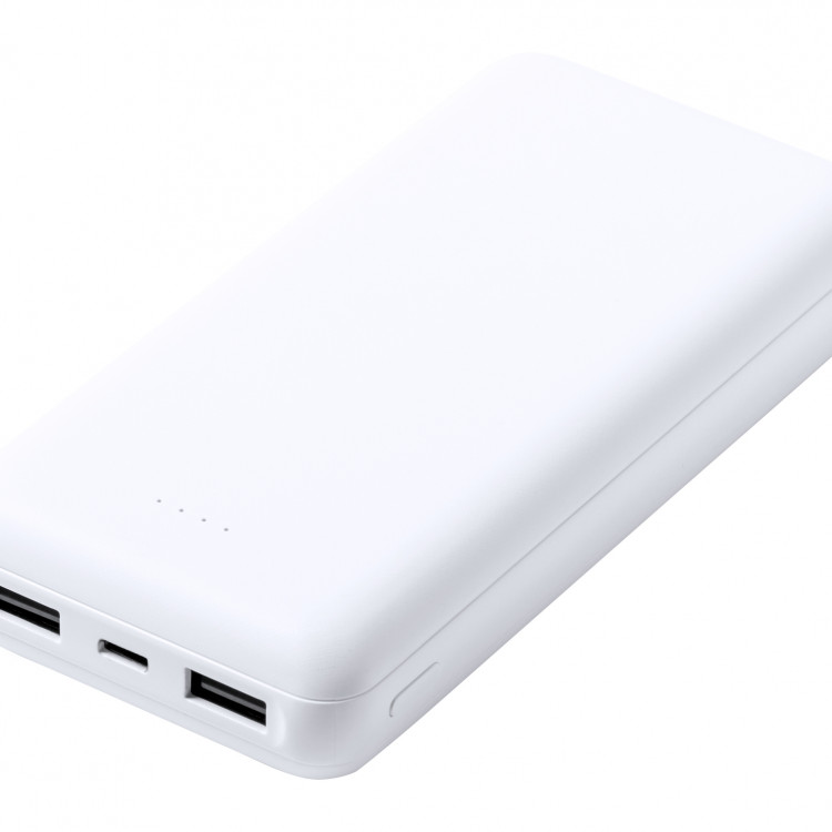 Пластичен USB power bank со батерија од 20 000 mAh. Со 1 USB-C и 2 USB порти за полнач. Power bank може да се полни преку USB-C приклучокот.
