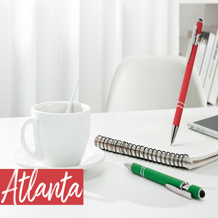 • Пенкало ATLANTA е стилско метално тач пенкало со плаво мастило, идеално за секојдневна употреба и промотивни цели.