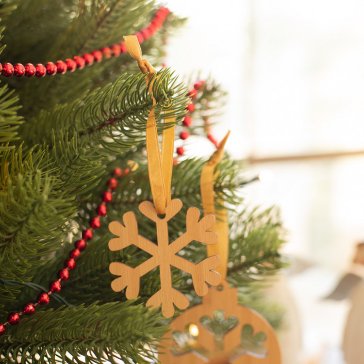 Новогодишни декорации во форма на снегулка 2 во 1 во бамбусова иверица со златни панделки. Се испорачува со одвоени ленти.