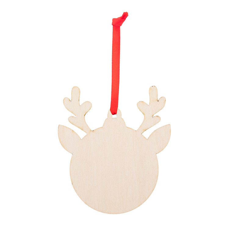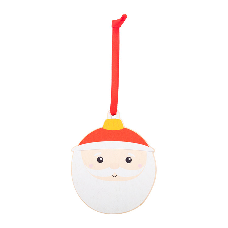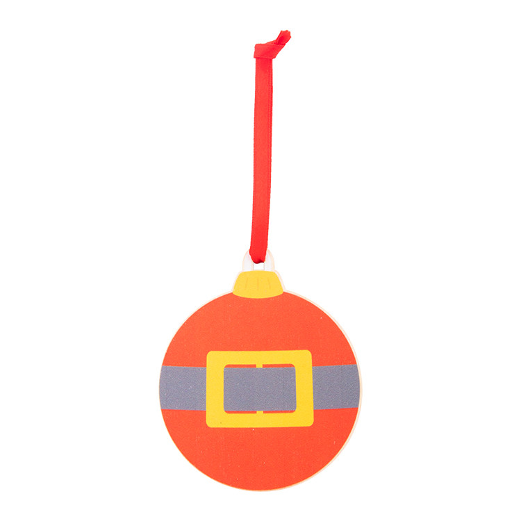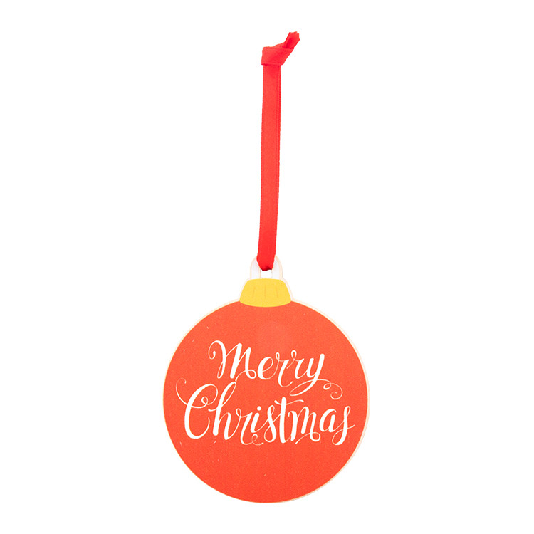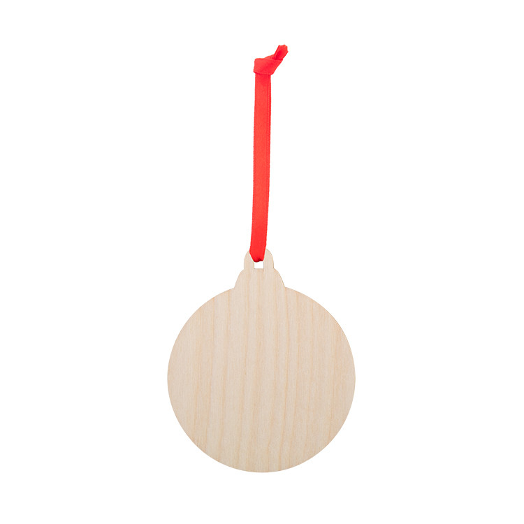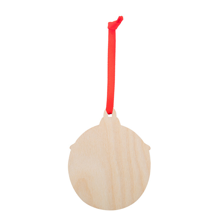 Новогодишен дрвен украс за новогодишна елка во форма на снегулка, со печатен божиќен дизајн и црвена лента. Се испорачува со одвоена лента.