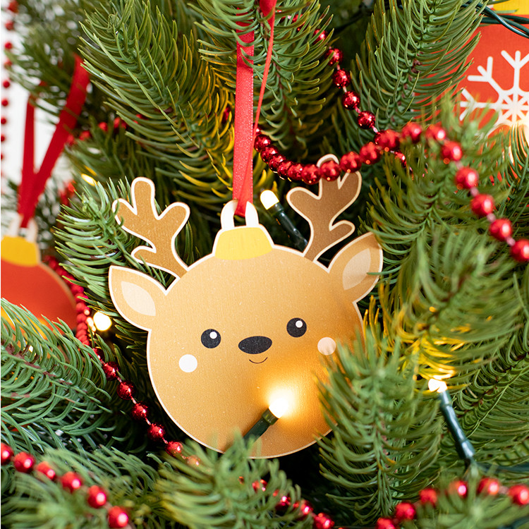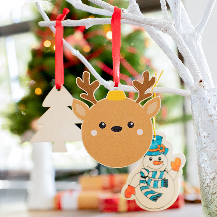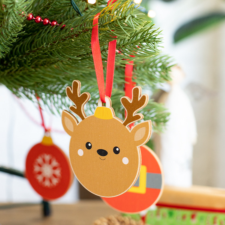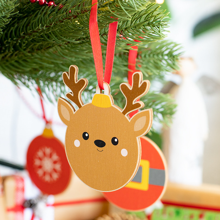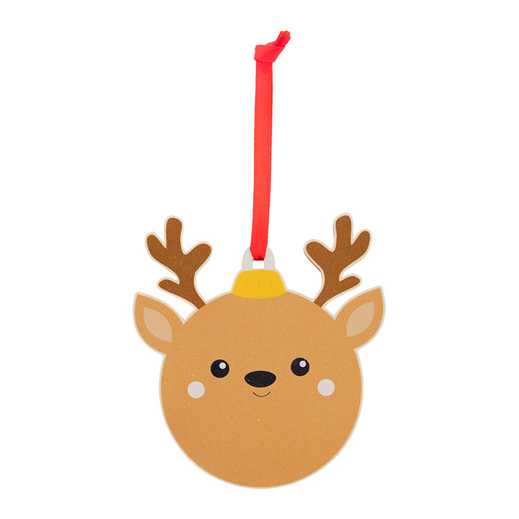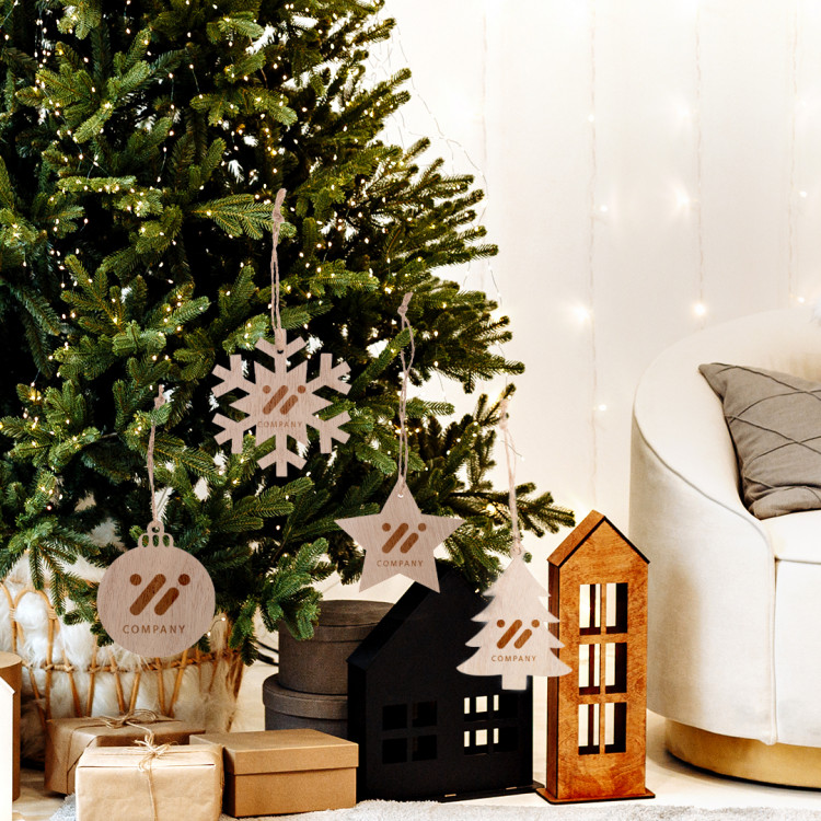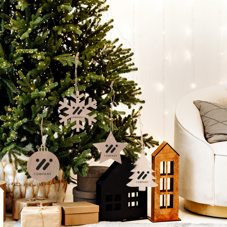 Новогодишен дрвен украс за новогодишна елка во форма на снегулка, со печатен божиќен дизајн и црвена лента. Се испорачува со одвоена лента.