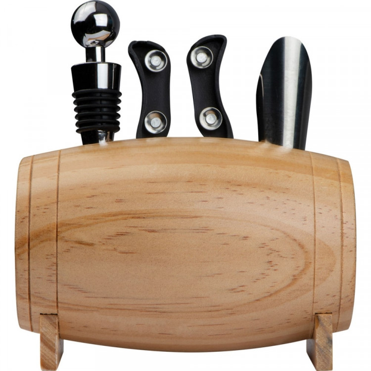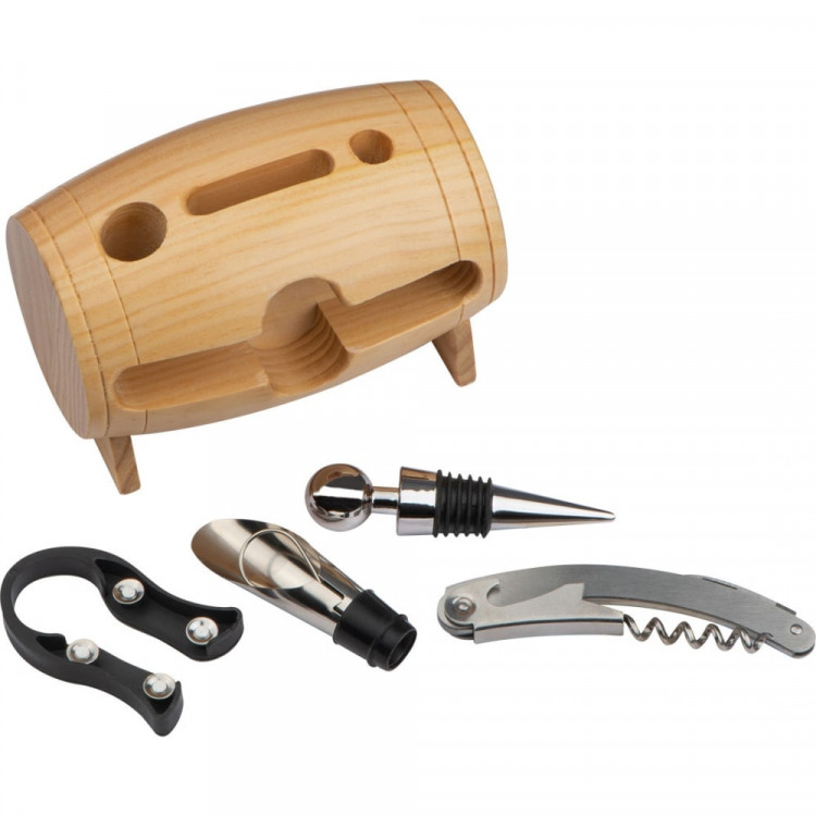 Сет за вино во форма на мало дрвено буре со нож за келнер, мијалник со шипки, една шипка и машина за сечење фолија. Се што ви треба за да го прославите виното. Вашето лого ќе биде врежано на бурето.