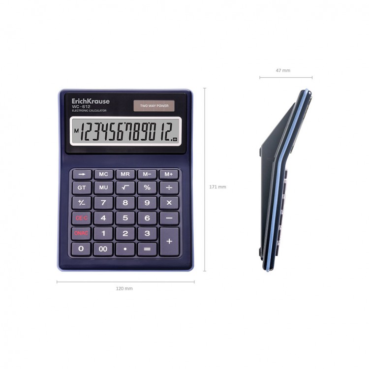 Електронскиот водоотпорен калкулатор во пластична рамка има 12-цифрен LCD дисплеј со акрилен капак. Заштитеното куќиште од влага, прашина, случајни прскања и загадувачи овозможува користење на калкулатор на отворено. Имајте мемориски клуч. Оптималниот сет на пресметковни функции овозможува извршување на основни математички операции, пресметување на проценти, маржа на мало, извлекување на квадратен корен, сумирање на извршените операции и меморирање на средниот резултат. Гумирана тастатура е опремена со копчиња со нула „00“ и копче за назад. Елементот за соларна енергија може да се полни и од директна сончева светлина и од канцелариски тавански светла, што помага да се заштеди полнење на алкална батерија. Напојувањето на калкулаторот автоматски се исклучува доколку уредот не се користи 7 минути.