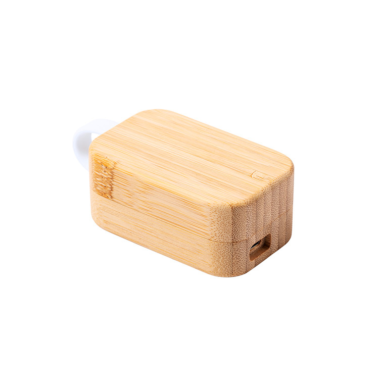 Безжични блутут слушалки со опција за разговор без употреба на рацете, во кутија за полнење од бамбус. Вклучуваат УСБ кабел за полнење.