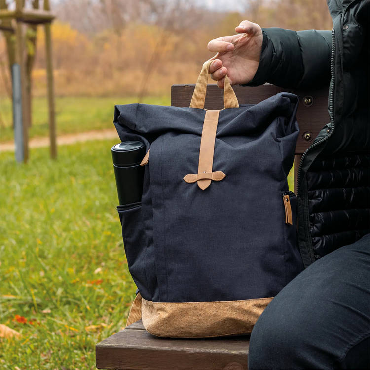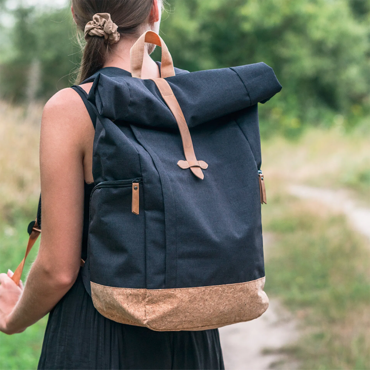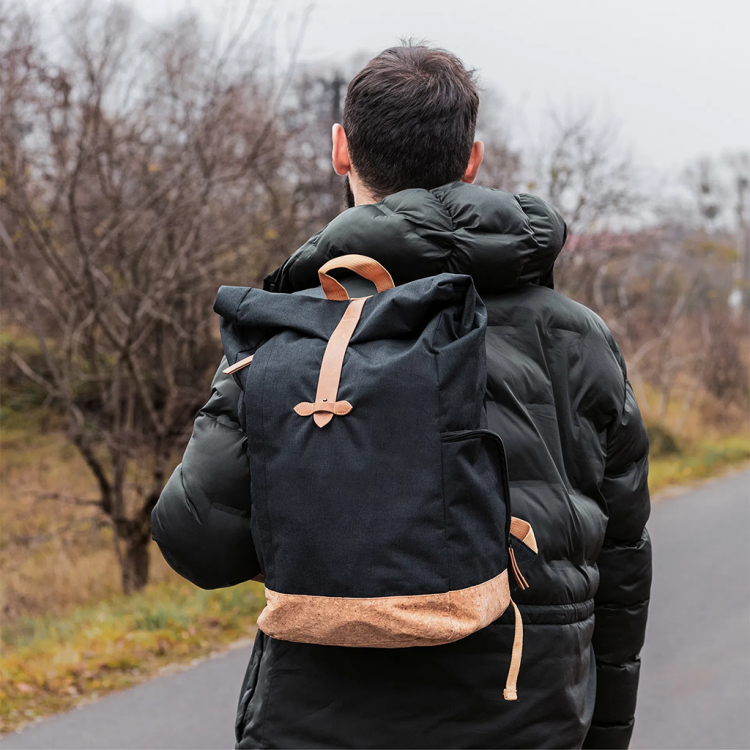 Одржливи материјали: Овој ранец е изработен од рециклирани PET шишиња и плута, придонесувајќи за намалување на влијанието врз средината.