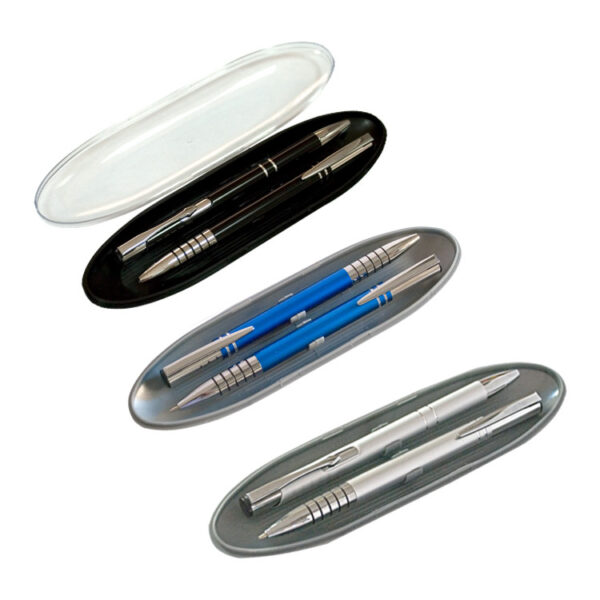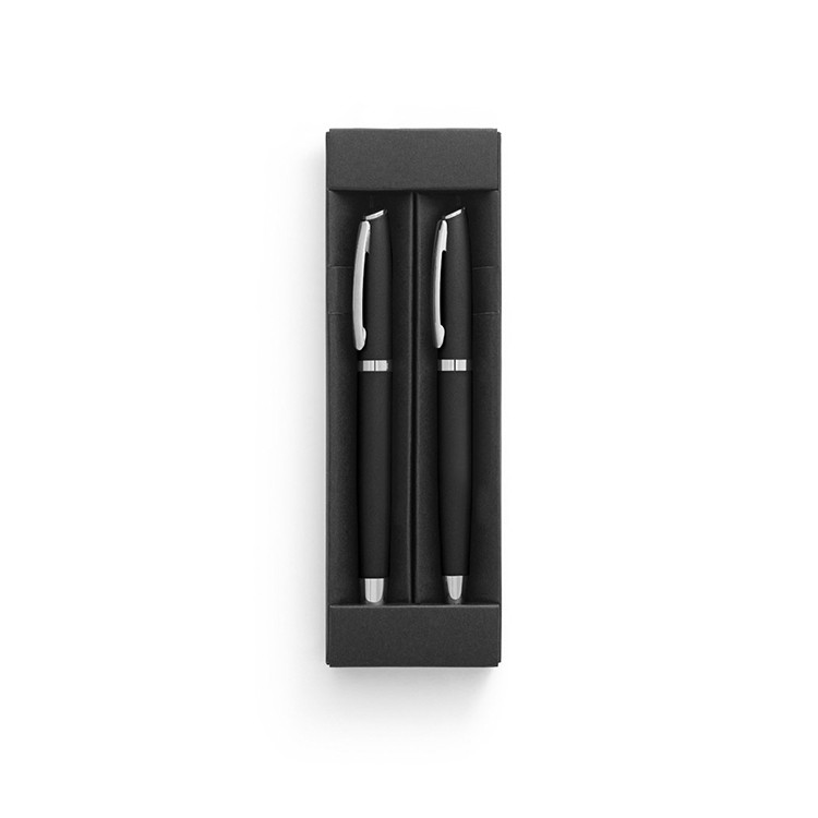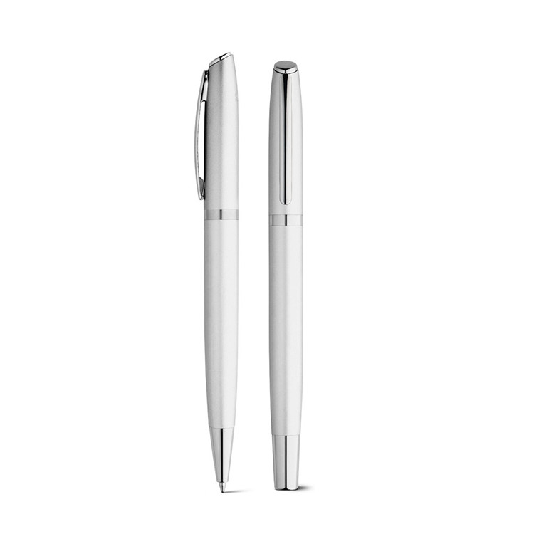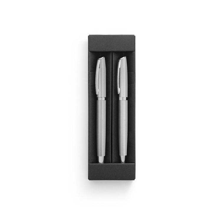 Сет со ролер и пенкало со алуминиумско (100% рециклирано) тело со метален клип и врвови. Комплетовите се во иста боја, а пенкалото има механизам за вртење. Сино мастило. Се испорачува во кутија за подарок од 100% рециклирана хартија. Ролери: ø11 x 140 mm , Пенкало: ø11 x 140 mm , Кутија: 178x46x29 mm