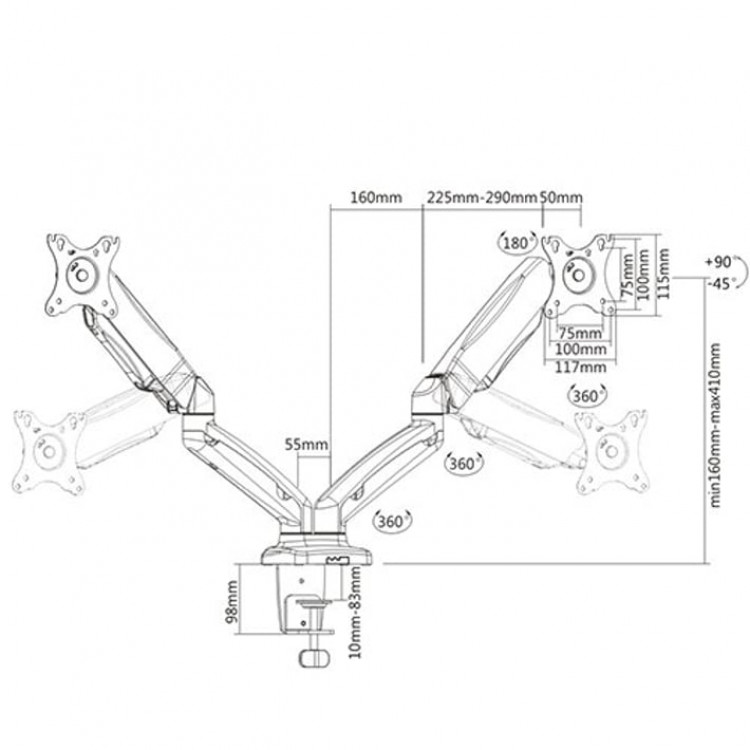 Овој држач за монитори е идеален избор за оние кои сакаат да креираат простор на работната површина и да ја подобрат флексибилноста и практичноста на својот работен простор. Со неговата димензионална флексибилност и максимална тежина на монитор од 6,5 кг, овој држач може да поддржи LCD монитори со големина од 17” до 32”. Целосната ротација од +180° до -180° и вртењето од +90° до -45° овозможуваат погодно поставување на мониторот според вашите потреби за гледање. Овој држач е направен од цврст челик и елегантен алуминиум, што му обезбедува издржливост и естетика. Овој држач поседува механизам за собирање на кабли, што дополнително го одржува вашиот работен простор чист и уреден. Исто така, овој држач за монитори одговара скоро на сите видови на бироа. Дополнително, држачот има 2.0 USB приклучоци и аудио приклучок во подножјето. Со сите свои функции за организација, функционалност и елегантен дизајн, овој држач за монитори е одличен додаток за сечиј работен простор.