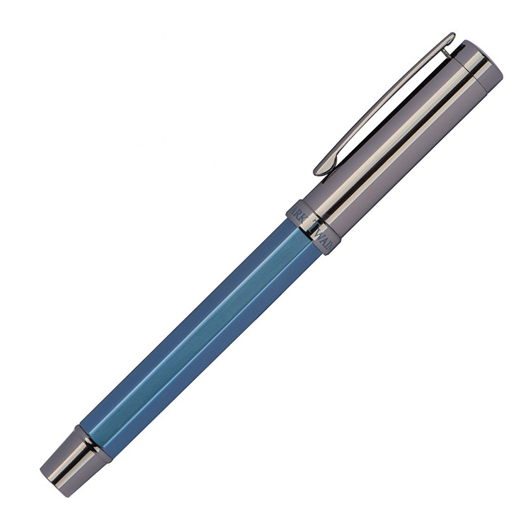 Сетот пенкала Mark Twain е висококвалитетна комбинација на хемиско и ролер пенкало. Овие пенкала се направени од метал со елегантен темно син финиш. Двете пенкала се опремени со плаво мастило. Сетот пенкала доаѓа во сина елегантна кутија, која е погодна за принтање и персонализирање. Овој сет е идеален за секој кој на дневна база се наоѓа во прилики каде му е потребно различен тип на пенкало. Ако барате погодно пенкало за запишување на белешки за време на состаноци тогаш искористе го хемиското пенкало од овој сет. Додека пак ако ви е потребно пенкало за потпишување на документи или покани каде што текстурата на мастилото, интензитетот и дебелината ви е битна во тие моменти користете го ролер пенкалотот од Mark Twain сетот. Ако сакате овој сет да го подарите на вашиот колега или близок пријател, испратете ни го посакуваното лого или текст и ќе добиете идеален персонализиран подарок кој можете да го подарите во различни прилики.