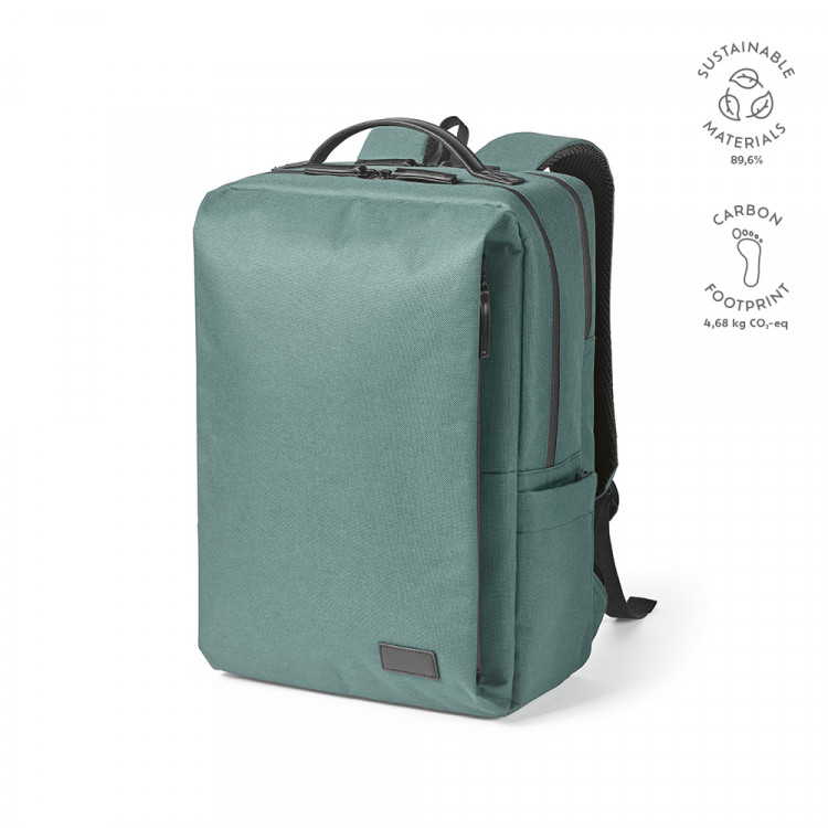 Овој 20-литарски ранец е изработен од 600D рециклиран полиестер. Се состои од 2 пространи џеба, водоотпорни патенти, држач за влечење и преграда за лаптоп од 17 инчи. Спакуван во рециклирана памучна торба.