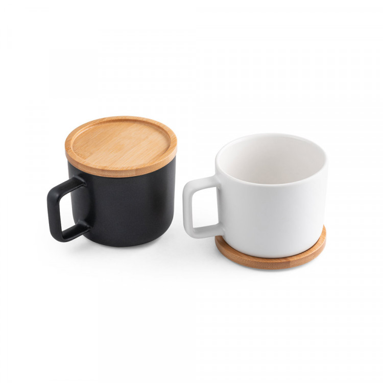 Керамичка чаша со капак од бамбус. Капацитет од 230 mL. Спакуванa во кутија за подарок од крафт хартија. Чашата може да се мие во машина за садови садови.