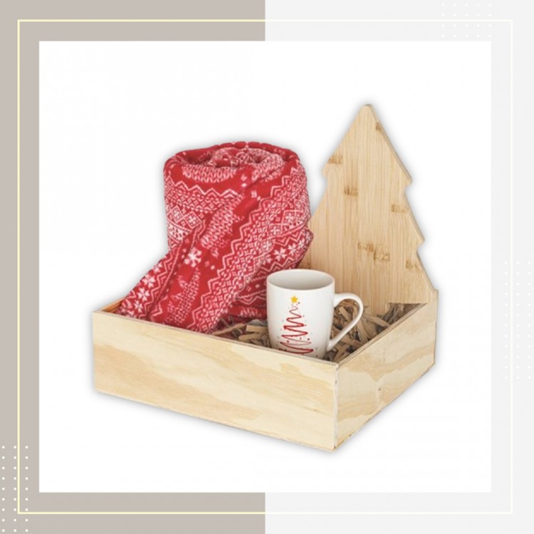 Новогодишен, божиќен комплет – се состои од керамичка чаша со новогодишен мотив, даска во форма на новогодишна елка и меко кадифено ќебе. Сите производи се спакувани во кутија од иверица со лизгачки капак.