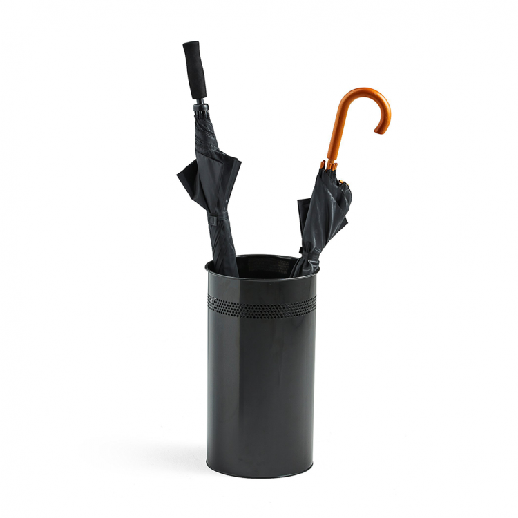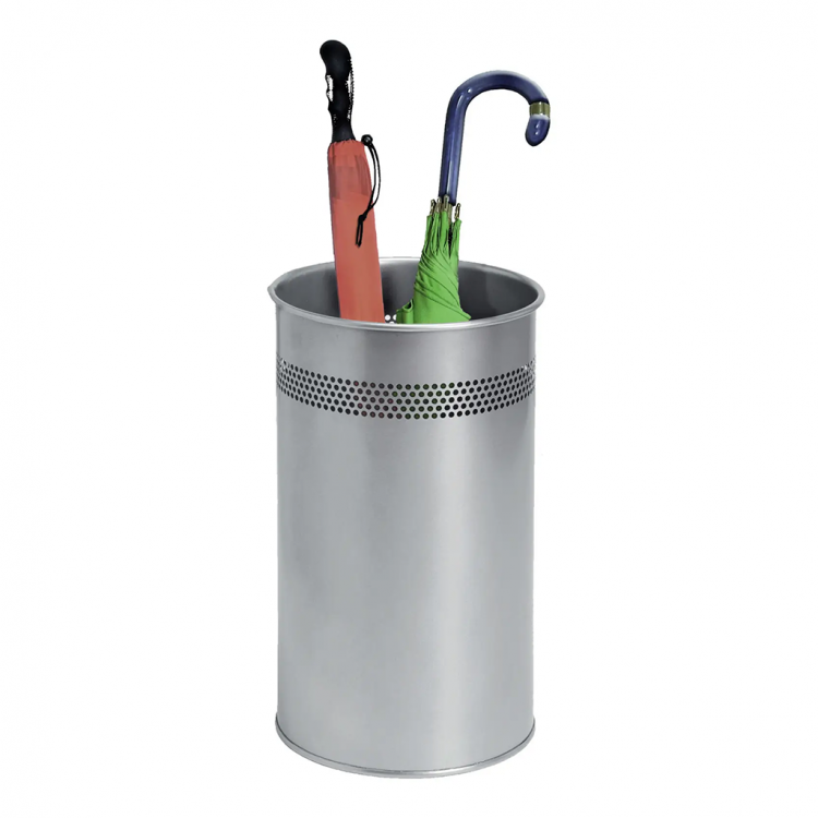 Елегантен и стабилен држач за чадори со модерен дизајн во металик боја. Изработен од висококвалитетен метал, овој производ е издржлив и функционален – може да се користи и како канта за хартија во канцелариски простории.