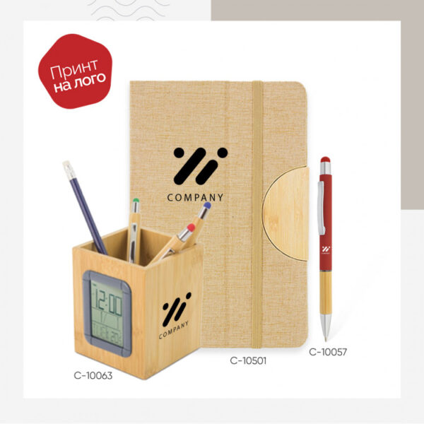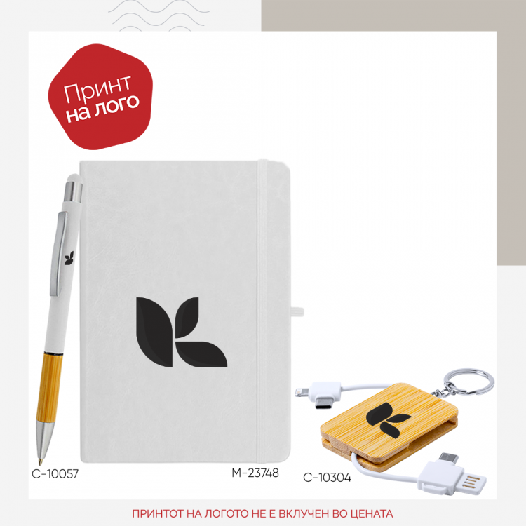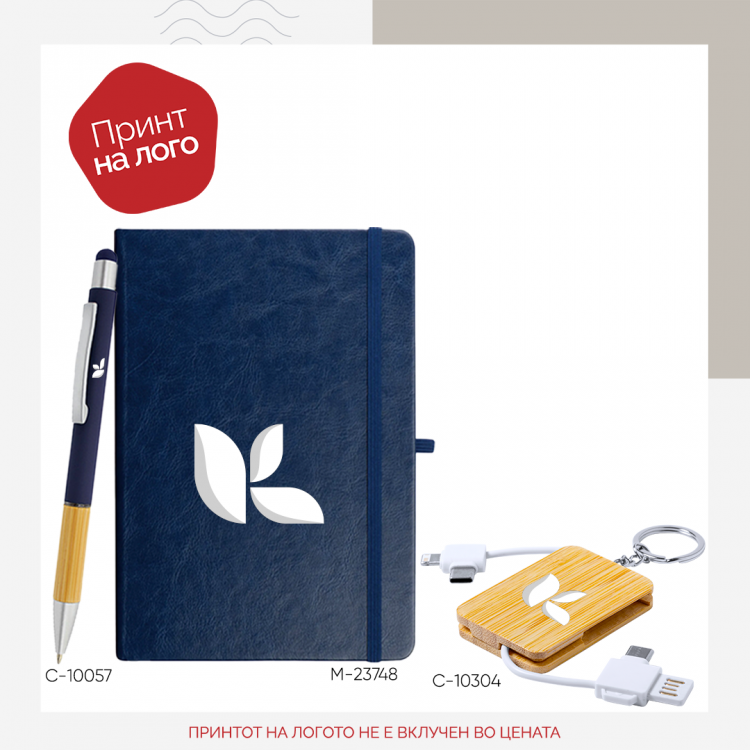 Овој промотивен подарок-сет е идеален избор за компании кои сакаат да понудат стилски и практичен бренд подарок. Сетот содржи A5 нотес со еластично затворање, метално пенкало и стилен привезок од природен бамбус со вграден USB кабел и три конектори – micro-USB, USB-C и Lightning – сè што е потребно за секој модерен професионалец. Достапен во повеќе бои, сетот овозможува целосно брендирање со лого на компанијата, што го прави одличен за Welcome пакети, деловни настани или корпоративни подароци. Комбинацијата од практичност и елегантен изглед го прави совршен избор за HR, маркетинг и корпоративен имиџ.
