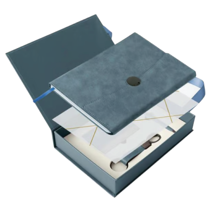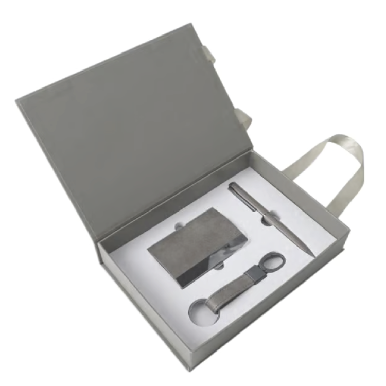 Овој префинет корпоративен подарок-сет комбинира практичност и деловна елеганција, идеален за бизнис настани, VIP клиенти или Welcome пакети за нови вработени. Сетот содржи A5 нотес, метално пенкало, кожен приврзок за клучеви и визитар (картичник), внимателно поставени во луксузна кутија со сатенски рачки. Изработен од квалитетни материјали како кожа (PU), метал и финa хартија, овој сет остава впечаток на професионализам и висок корпоративен стандард. Персонализацијата со лого го прави совршен избор за брендирање и деловни подароци што се користат секојдневно.