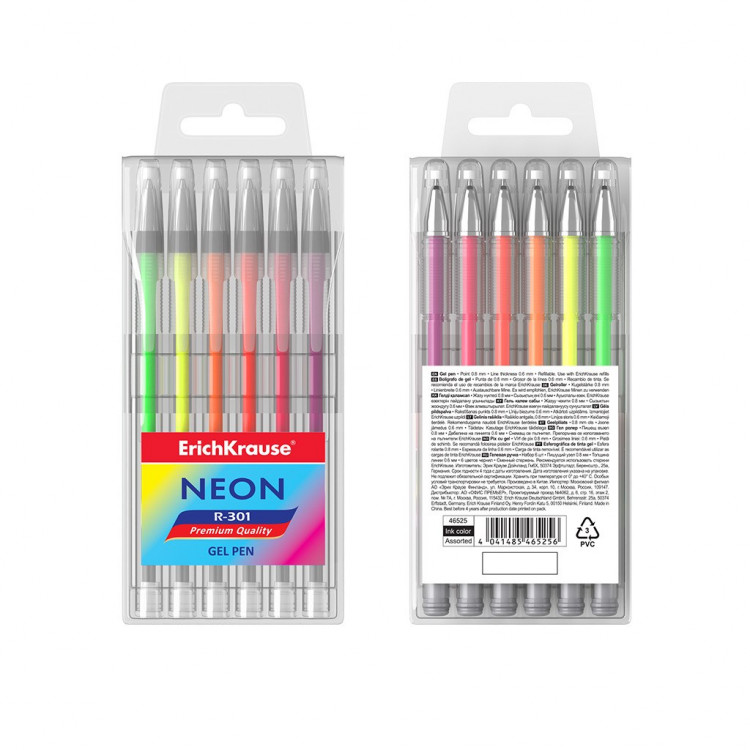Комплет во проѕирна мека торбичка која се состои од 6 пенкала со мастило со гел Stick со стандарден тип на врв и заменливо полнење што го содржи светлиот неонинк. Пенкалото има препознатлив дизајн R-301 Classic Gel Stick и проѕирно тркалезно тело со удобен дел за држење и вентилирачко капаче. Врвот со 5 канали со дијаметар на топката од 0,8 mm во комбинација со мастилото за гел што брзо се суши овозможува лесно точно и брзо пишување. Должината на континуираната линија е 400 m на ширина од 0,6 mm, што е висока стапка во својата категорија.
